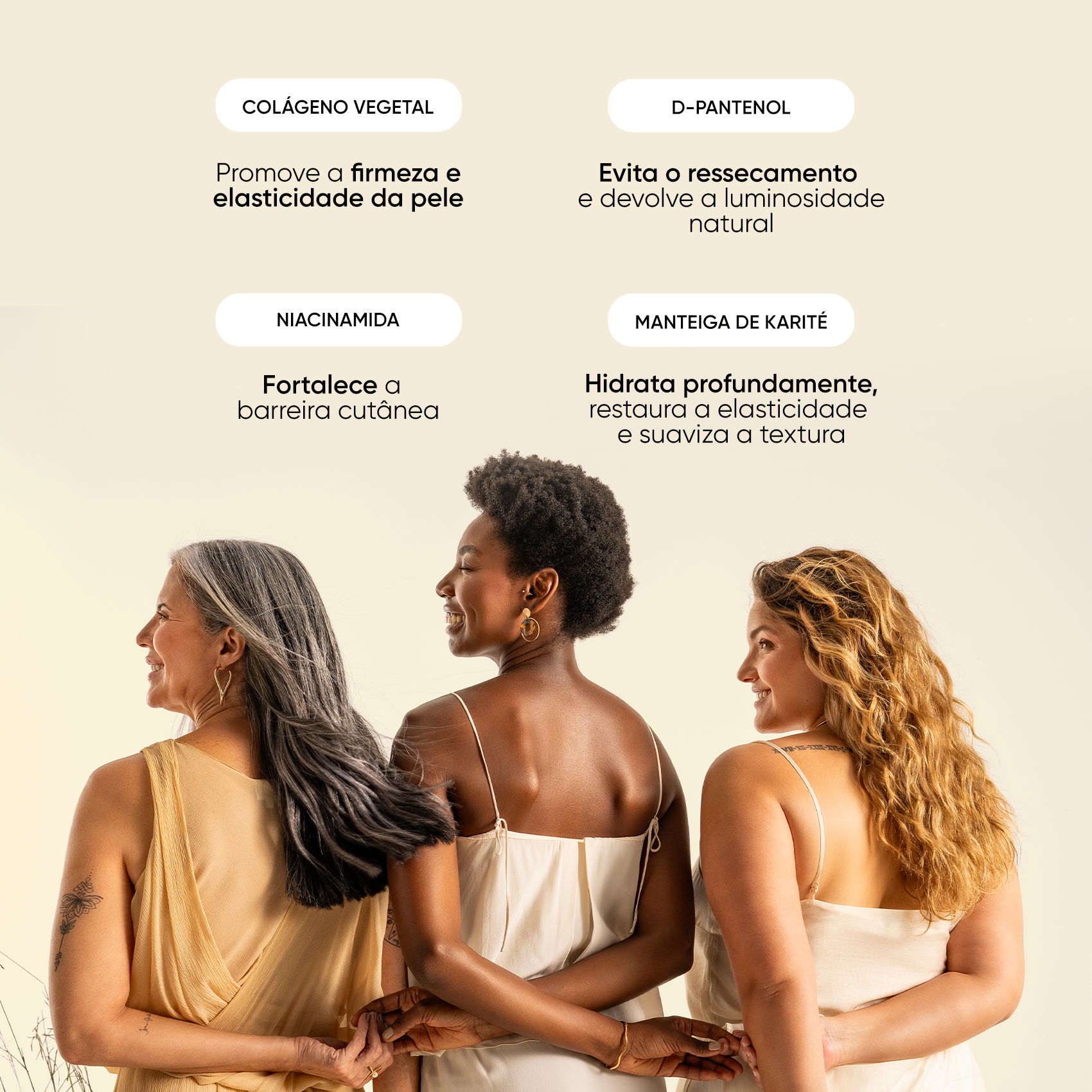 Já o Hidratante Corporal entrega hidratação intensa e sensorial refinado. Formulado com Niacinamida, Manteiga de Karité, D-Pantenol e Colágeno Vegetal, proporciona +16% de hidratação e +10% de firmeza em 28 dias, deixando a pele mais luminosa, macia e confortável.