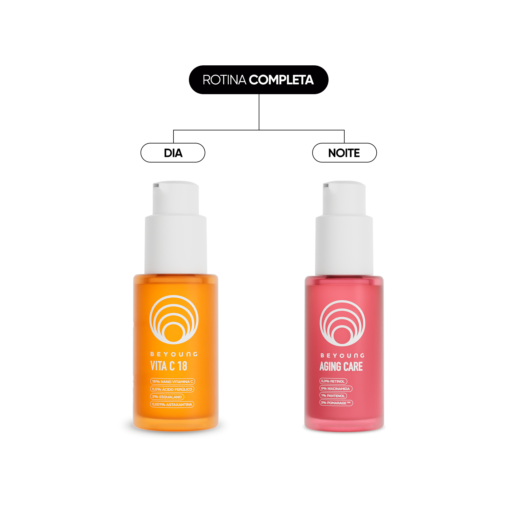 O envelhecimento da pele é natural, mas o cuidado precisa acompanhar esse processo. A Dupla Pro-Aging oferece um skincare completo em apenas dois passos para recuperar os danos e prevenir o envelhecimento precoce. Pela manhã, o Vita C 18, com sua Nano Vitamina C a 18%, ilumina e uniformiza o tom da pele, proporcionando uma aparência radiante e protegida contra os agressores do ambiente urbano. À noite, o Aging Care com Retinol em máxima concentração, atua na renovação celular, suavizando os sinais da idade e deixando a pele mais macia, iluminada e rejuvenescida.