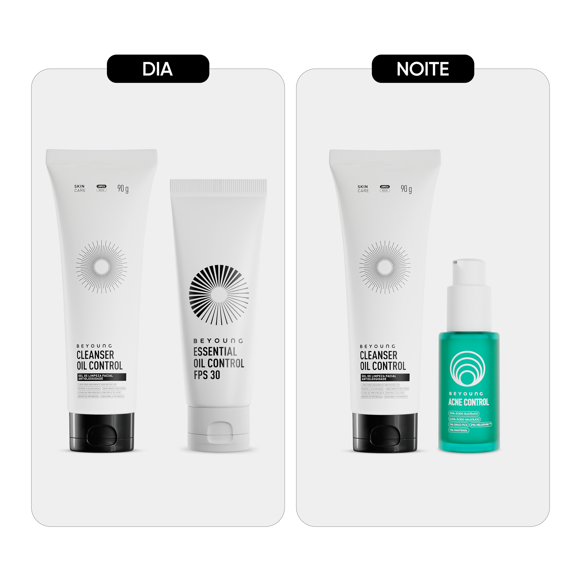 São três passos simples e essenciais para quem deseja controlar a oleosidade e ter uma rotina antiacne básica e rápida: limpeza profunda que não resseca a pele, tratamento potente e equilibrado que controla a oleosidade nos primeiros 15 minutos de uso e também controla a acne em até 30 dias, e proteção solar com toque seco.